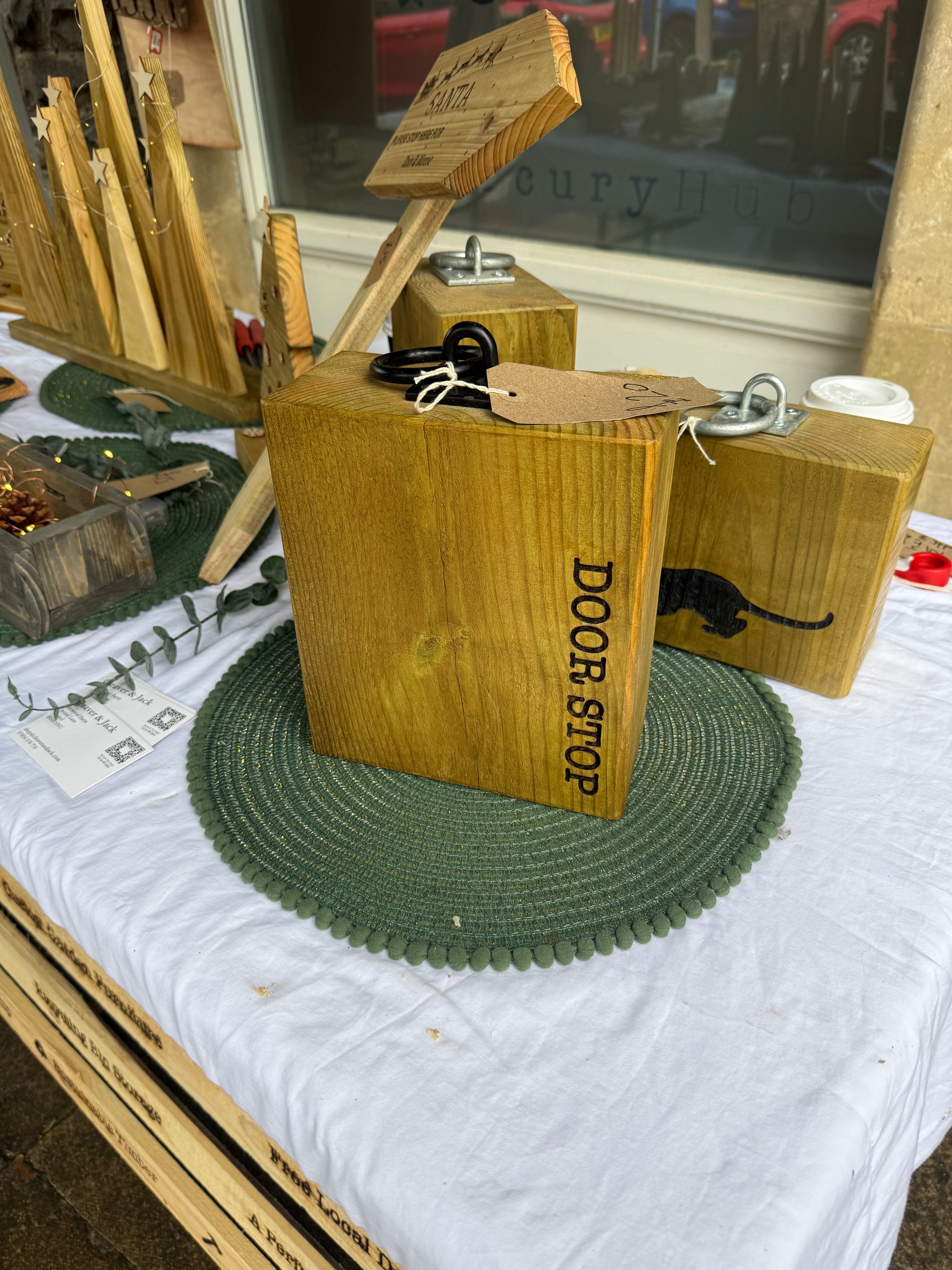 • Rustic Design: Finished with vertical "DOOR STOP" stenciling and visible wood grain for a vintage, industrial look.